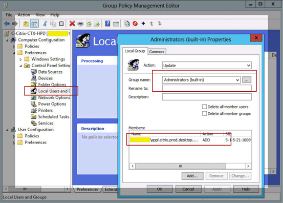 As you can see there are accounts such as CitrixClusterService and CitrixConfigurationReplication that are local accounts also added automatically into the local administrators group during installation. These accounts must remain there for Storefront to function correctly. Using “Restricted Groups” removes these accounts and replaces them with only those domain user accounts that you specify. So refrain from using “Restricted Groups”.