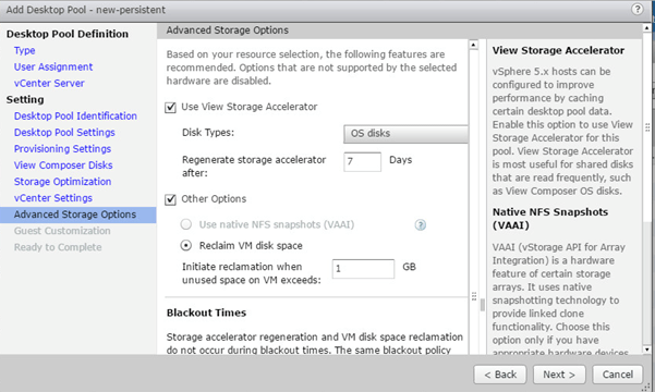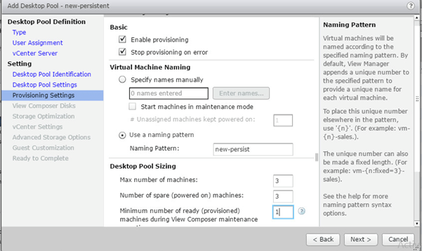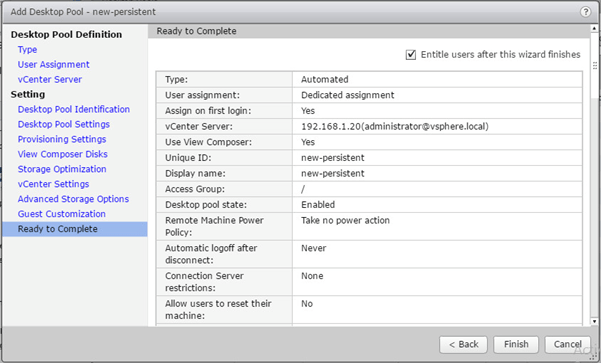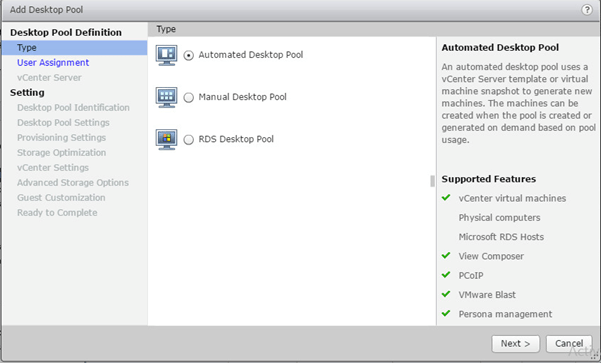 • You will now create a Desktop Pool for Persistent disk based desktops on the new VMware cluster.